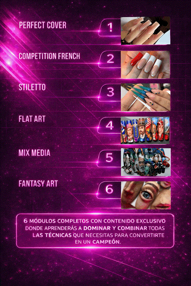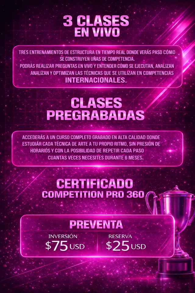 Competition Pro 360 es un programa de formación online de alto nivel diseñado para nail artists que desean dominar las técnicas reales de competencia y elevar su trabajo al estándar de los campeonatos internacionales. A través de 3 clases en vivo y un completo sistema de clases pregrabadas en alta calidad, accederás a un entrenamiento profesional donde aprenderás cómo se construyen, analizan y optimizan uñas de competencia, desde la estructura y simetría hasta el french, el balance y el acabado final. Podrás observar cada paso del proceso con claridad, entender la lógica detrás de cada técnica y entrenar a tu propio ritmo, con acceso durante 6 meses para repetir las lecciones cuantas veces necesites. Este programa no está enfocado en uñas comerciales, sino en desarrollar criterio, precisión y técnica de alto rendimiento, tal como se exige en competencias nacionales e internacionales. Al finalizar, recibirás el Certificado Competition Pro 360, que avala tu formación en técnicas de competición y respalda tu perfil profesional dentro del mundo competitivo de las uñas.